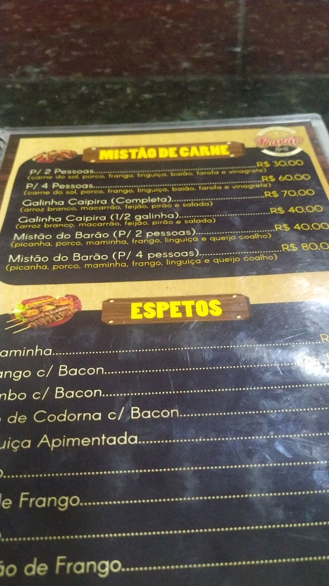 Barão Grill | Churrascaria E Pizzaria offers a flavorful menu that blends traditional Brazilian barbecue with classic Italian pizza. One of the standout dishes is the Pizza Calabresa Com Portuguesa, a savory combination of sausage, ham, olives, and onions, perfect for anyone craving a hearty meal. For a true taste of local flavor, the Baião is a must-try, with its rich mix of beans, rice, and dried beef. Whether you're looking for a refreshing drink or a side to complement your meal, the Coca Cola Gelo E Limão offers a zesty twist, while the Cider provides a crisp, fruity option to cool down. If you're in the mood for something more substantial, the Espetinho de Lombo de Porco Com Bacon delivers a satisfying, smoky taste with tender pork and crispy bacon. The diverse menu ensures that there's something for everyone, making Barão Grill a go-to spot for those looking to enjoy both pizza and Brazilian barbecue in one place.